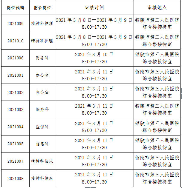 三、現(xiàn)場(chǎng)資格確認(rèn)所帶材料:必須本人前來并攜帶本人身份證、畢業(yè)證、學(xué)位證、執(zhí)業(yè)資格證、住院醫(yī)師規(guī)范化培訓(xùn)合格證等證書原件、崗位需求的相關(guān)工作證明和一寸彩色免冠正面照片兩張。今年應(yīng)屆畢業(yè)生憑學(xué)校證明或?qū)W校就業(yè)推薦表確認(rèn)。具體根據(jù)《銅陵市第三人民醫(yī)院2021年公開招聘工作人員公告》各崗位要求進(jìn)行。