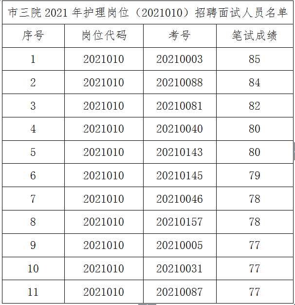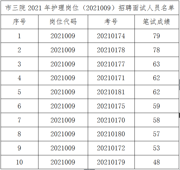 根據(jù)《銅陵市第三人民醫(yī)院2021年公開招聘工作人員公告》,市三院2021年護理崗位(2021010、2021009)招聘考試面試入圍人員共21人(含并列)名單如下,請面試人員于3月21日上午8:00前到市三院綜合樓三樓抽簽面試。