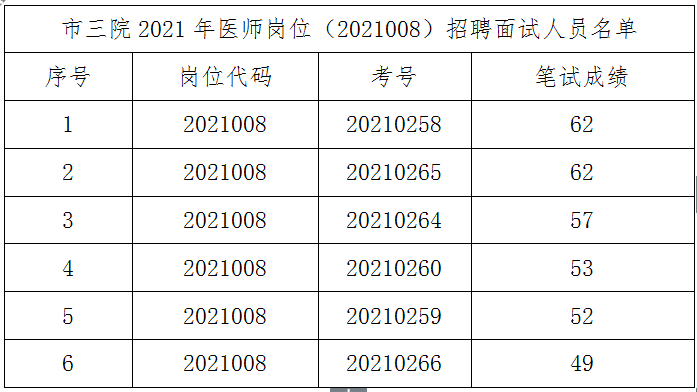 根據(jù)《銅陵市第三人民醫(yī)院2021年公開招聘工作人員公告》,市三院2021年醫(yī)師崗位(2021008)招聘考試面試入圍人員共6人(含并列)名單如下,請(qǐng)面試人員于3月21日上午8:00前到市三院綜合樓三樓抽簽面試。
